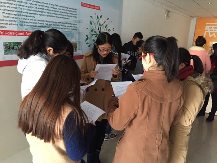 全新的地点,全新的环境,为外语角活动增添了生机与活力,虽然大雾弥漫,寒风刺骨,也挡不住同学们在外语角展示自我的热情。在悠扬的歌声中,全新的外语角拉开帷幕。在领读同学的感染下,朗朗书声不绝于耳,同学们纷纷被此热情所感染,都沉浸在了英语之中。随后,英语爱好者们两两成行,以英语对话的方式进行现场聊天,既提高了同学们的英语口语能力,又克服了同学们不敢将英语说出口的心理阻碍。 最后,英语接龙等游戏也为忙碌了一周的同学们带来了欢乐,同学们纷纷畅所欲言,表达自己的看法,现场气氛十分愉快热烈。
