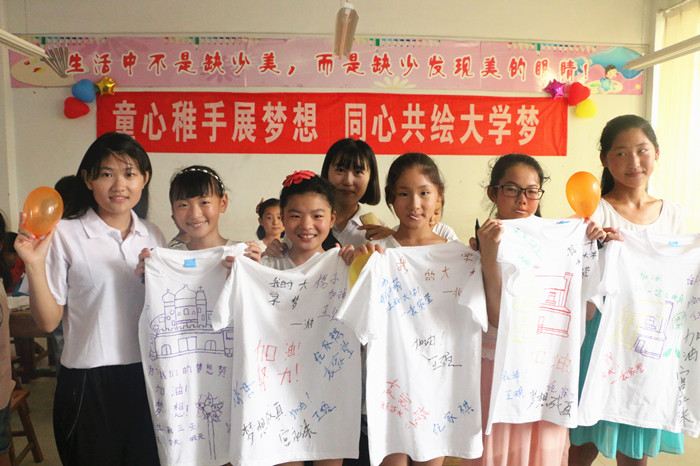 7月14日下午,一堂别开生面的“大学梦想”课堂在临沂兰陵县下村乡中心小学开讲。实践队员袁家莹通过生动直观的PPT展示,用活泼有趣的语言向山区的30余名小朋友们描述了世界和中国的知名大学,让小朋友第一次知道了在大山的外面还有那么多美丽的大学。随后,在实践队员的引导下,小朋友们在白色T恤上用彩色的画笔描绘自己心中理想的大学,五彩的画笔勾勒出儿童心中的大学梦想,大学生们期望用这样的形式将“大学梦”这颗梦想的种子播撒在山区小朋友们的心田,引领他们未来的求学之路。