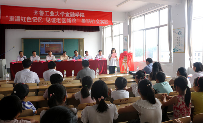 7月13日-7月15日,金融学院“重温红色记忆 见证老区新貌”暑期社会实践活动在红色革命老区临沂兰陵县举行。实践队在兰陵县下村乡中心小学,开展“童心同愿共绘大学梦”主题梦想课堂,把“农村电子商务大讲堂”引入林果之乡,在鲁南革命历史纪念馆追寻红色记忆,用实际行动践行“两学一做”精神要求,用青春追逐大学梦想。齐鲁工业大学副校长周有波、兰陵县委副书记、县长薛峰以及校团委、办公室和兰陵县相关负责人出席了活动。金融学院暑期社会实践队带队老师和队员以及互联网金融、投资系专业老师20人参加了活动。