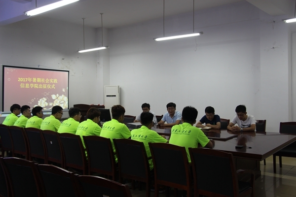 为响应学校“三下乡·千村行动”专项行动的号召,引领和帮助信息学子在社会实践中受教育、长才干、作贡献。7月7日上午,信息学院2017年暑期社会实践出征仪式于机电楼A座六楼会议室举行。信息学院党委书记王玉立,党委副书记王更新、团委书记艾洪庆出席了本次仪式,指导老师陈德坤以及社会实践全体成员参加。