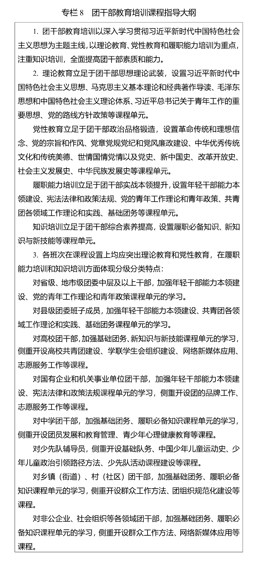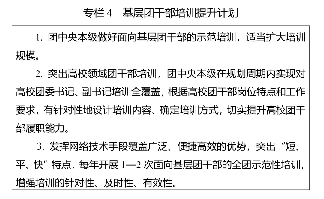 新一轮《规划》坚持把习近平新时代中国特色社会主义思想作为团干部教育培训的根本遵循和主题主线,深入贯彻习近平总书记关于党的建设的重要思想和习近平总书记关于青年工作的重要思想,聚焦提升团干部政治能力、理论素养、群众工作本领,系统谋划未来五年团干部教育培训工作。《规划》共8个部分、设置9个专栏,明确了团干部教育培训的总体要求,对开展习近平新时代中国特色社会主义思想教育培训、加强政治训练和履职能力培训作出专门部署,对团干部教育培训资源建设、网络培训体系建设、教育培训改革创新深化和组织领导等方面作出部署安排。
